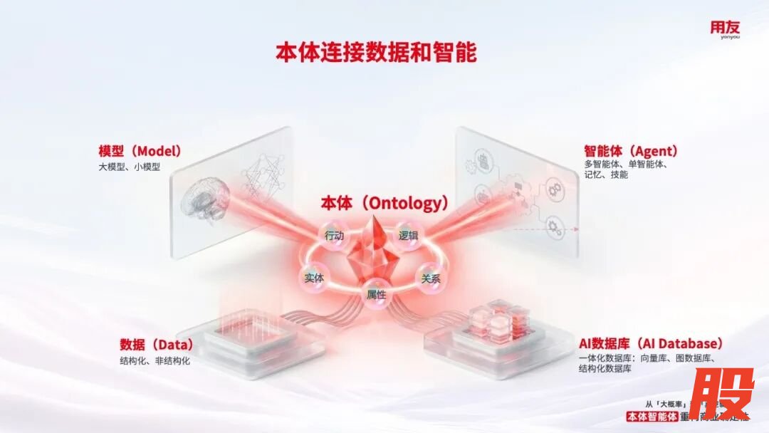 BIP“本体智能体”(Ontology-Driven Agent)植根于用友37年深耕企业服务领域沉淀的行业Know-how,以本体(Ontology)为核心纽带,连接结构化与非结构化数据,打通智能体、模型、数据、AI数据库的协同链路,通过对业务实体、关系、流程与状态变化的全面建模,构建出与真实业务运营实时同步、可交互且动态演进的数字孪生。