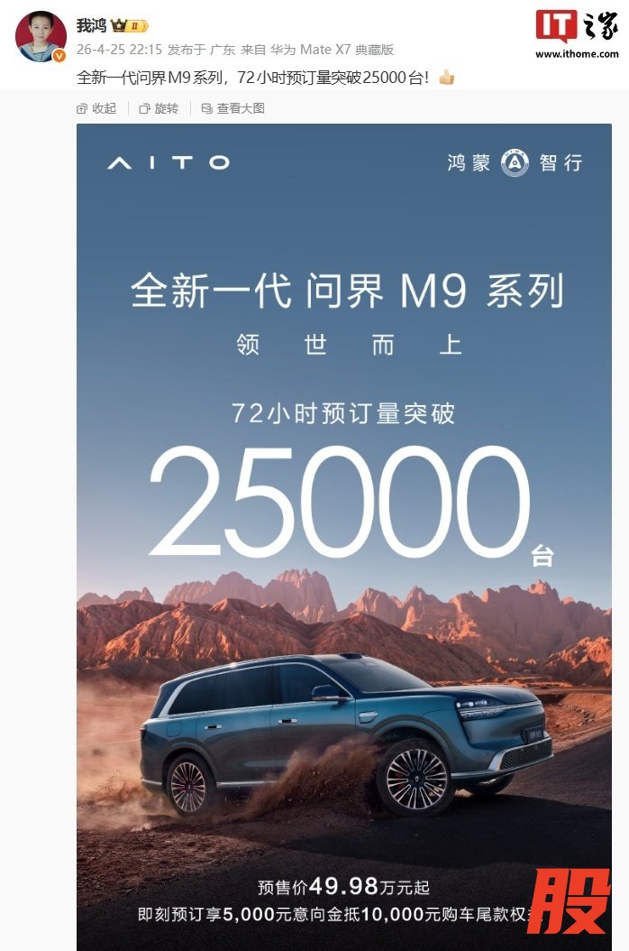据博主 @我鸿 分享,全新一代问界 M9 系列汽车 72 小时预订量突破 25000 台。该车预售价 49.98 万元起。华为常务董事、产品投资评审委员会主任、终端 BG 董事长余承东曾表示,全新一代问界 M9 全车搭载超 140 项创新技术,不是一次升级,而是一次重构,后续还会公布更多惊喜。